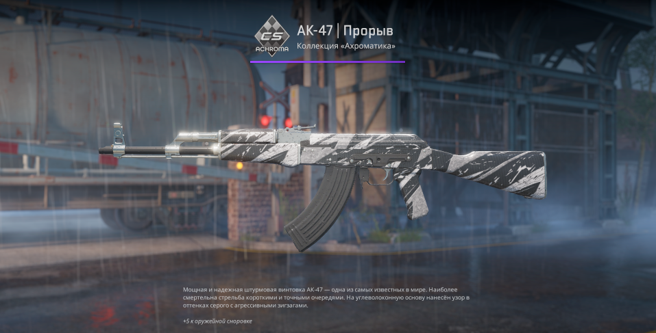 Он построен на новой коллекции Achroma, а это всегда плюс: такие скины часто держат цену стабильнее, чем старые бюджетные коллекции.