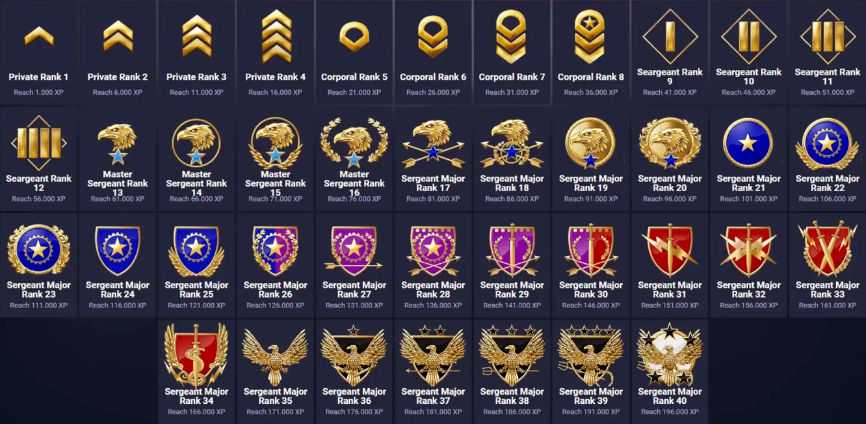 В Counter-Strike 2 существует шесть уровней медали за службу. Каждый уровень отличается цветом и отражает количество полных циклов прокачки профиля за один год. Уровень медали показывает, сколько раз за год игрок достиг максимального 40-го уровня профиля.