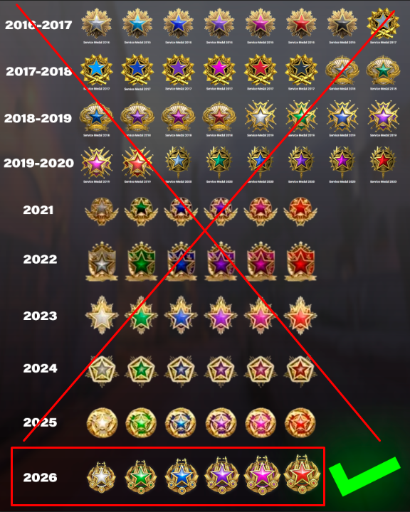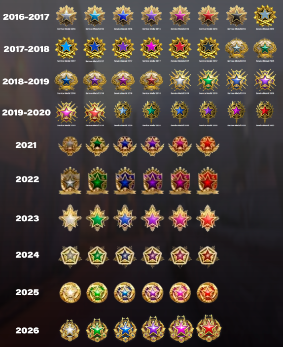 Система медалей за службу появилась ещё в 2015 году и с тех пор стала неотъемлемой частью прогресса любого игрока. Каждый календарный год Valve выпускает новую медаль с уникальным дизайном, а предыдущие версии навсегда уходят в историю и становятся недоступными для получения.