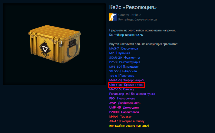 Скин входит в коллекцию «Революция». Даже в состоянии «После полевых испытаний» рисунок остаётся чётким, а затемнения лишь усиливают ощущение мистики. Отличный выбор для тех, кто хочет стильный пистолет без лишних затрат.