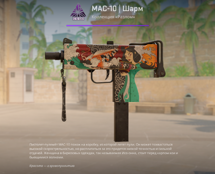 MAC-10 | Шарм — яркий и лёгкий скин с восточным колоритом для одного из самых популярных SMG. Его дизайн построен на мягких цветах и декоративных элементах, которые выгодно выделяются на фоне стандартных камуфляжей.
