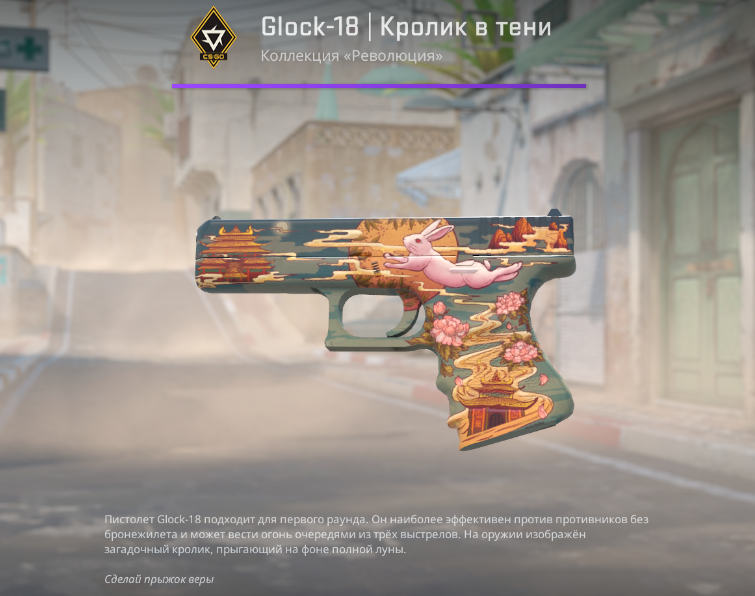 Glock-18 | Кролик в тени — один из самых атмосферных бюджетных скинов для стартового пистолета стороны T. Оформление выполнено в тёмных, приглушённых тонах, а центральным элементом является загадочный силуэт кролика на фоне ночной природы.