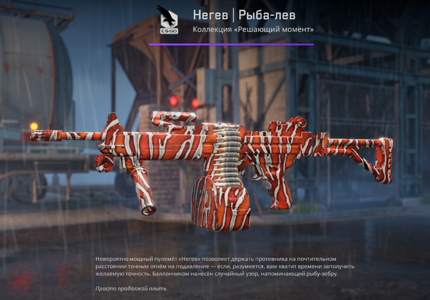 Negev | Рыба-лев — редкий пример действительно красивого скина для тяжёлого пулемёта. Морская тематика, контрастные узоры и стилизованное изображение экзотической рыбы создают запоминающийся визуальный образ.
