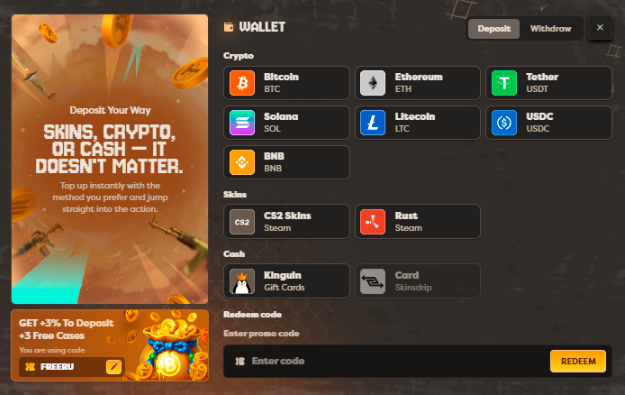 Пользователи могут вводить промокоды для получения дополнительных бонусов. Например, промокод FREERU даёт +3% к пополнению баланса и 3 бесплатных кейса CS2. Ввод промокода осуществляется в поле Affiliate Code при нажатии на ник пользователя в правом верхнем углу сайта.