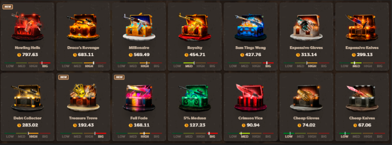 Ассортимент включает рискованные кейсы, фарм-кейсы, тематические подборки и уникальные кейсы от платформы. Каждый пользователь может создать собственный кейс, выбрав его название, дизайн и содержимое.