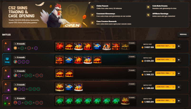 Case Battles - Кейс-баттлы позволяют соревноваться с другими игроками. Пользователи открывают одинаковые кейсы, а победителем становится тот, кому выпали более дорогие предметы. Победитель забирает весь дроп из баттла.