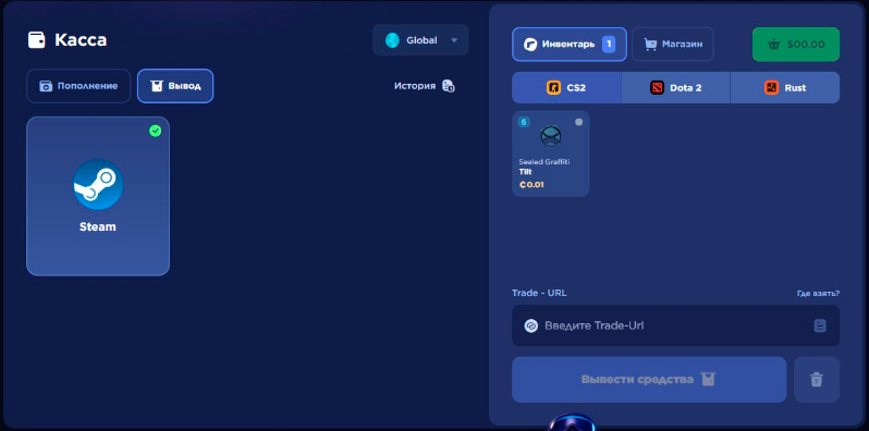 Вывод средств осуществляется непосредственно на ваш Steam-аккаунт скинами CS2, RUST, Dota2, что делает процесс простым и безопасным.
