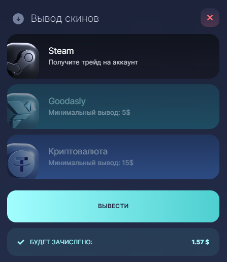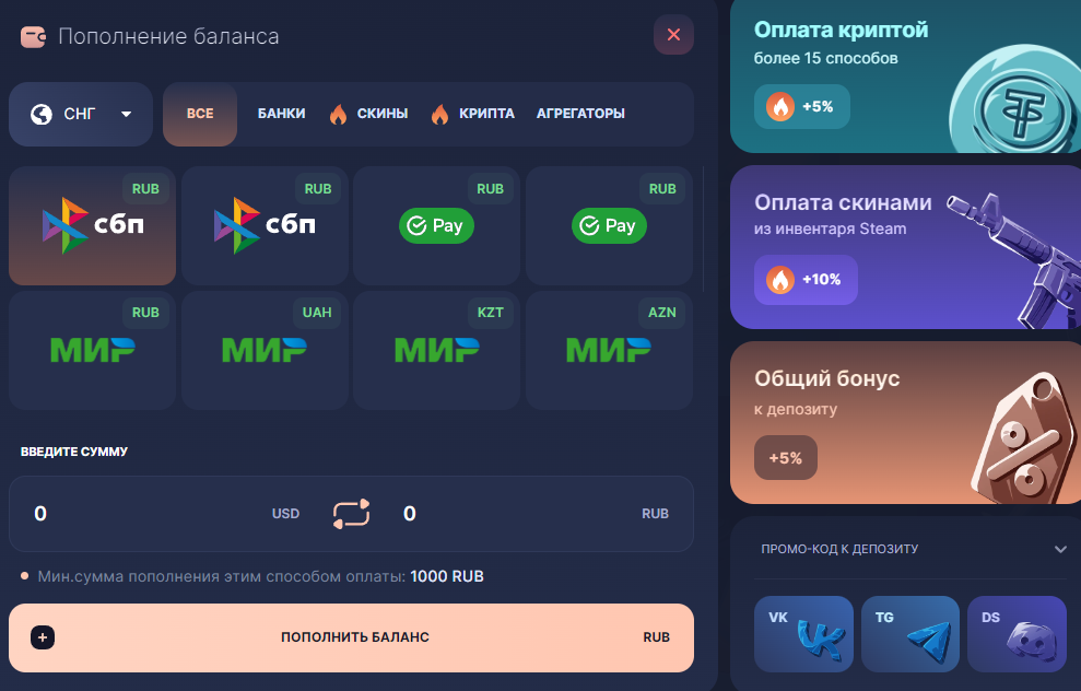 Розыгрыши скинов. Всего есть 6 розыгрышей: один ежемесячный, один еженедельный, три ежедневных и один каждые полчаса. Условия для участия в розыгрышах – пополнить баланс за 24 часа на ту сумму, которая указана в условиях.