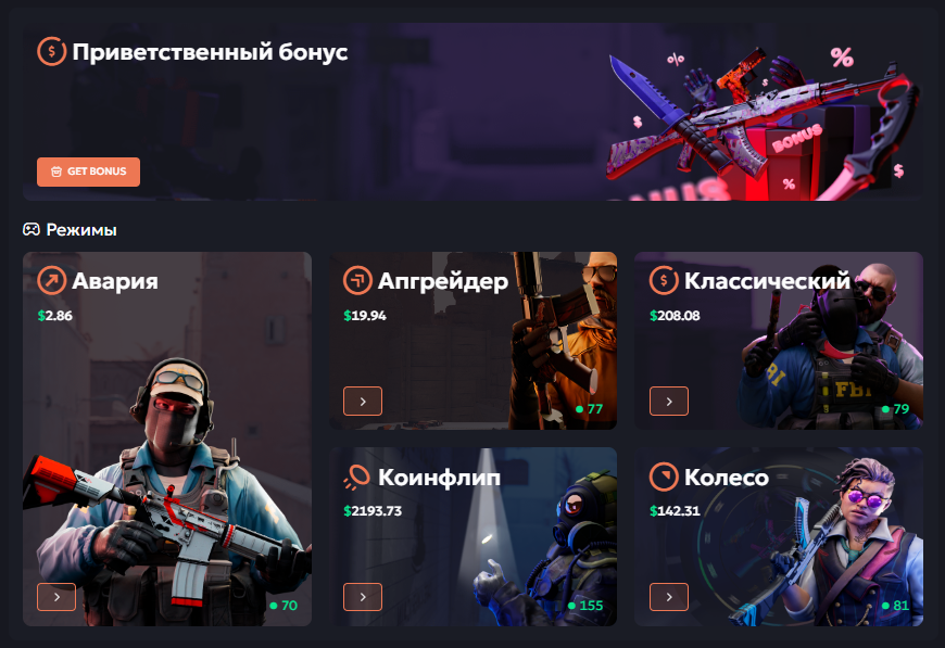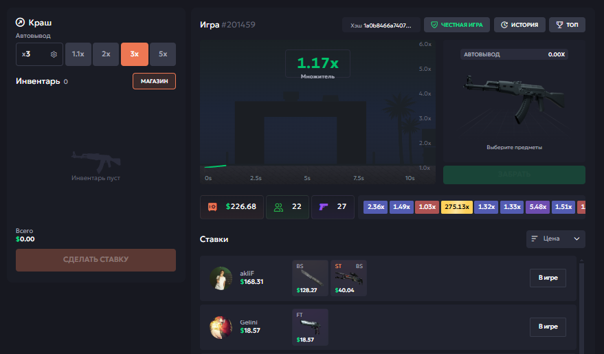 Краш: Игроки выбирают предмет и коэффициент. Если график достигает указанного коэффициента без обрушения, игрок получает скин, стоимость которого зависит от коэффициента.