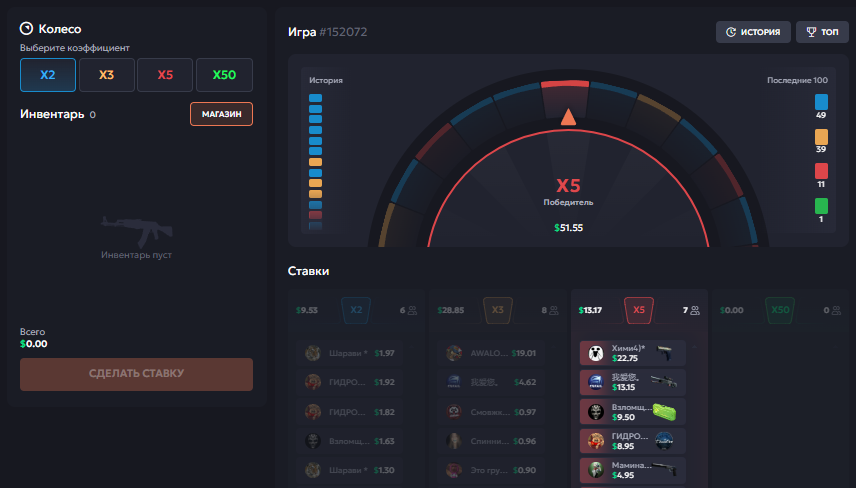Classic: Рулетка, где игроки используют скины. Шанс выигрыша зависит от размера внесенной суммы.