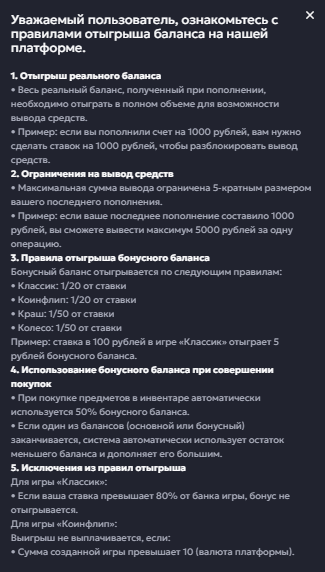 Средства, внесенные на счет, необходимо полностью использовать в играх для активации вывода. Например, при пополнении на 1000Р нужно сделать взносы на ту же сумму, чтобы разблокировать вывод.