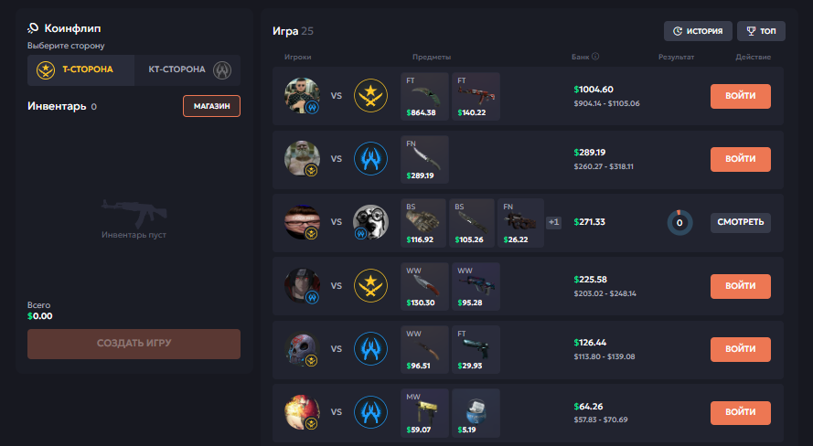 Коинфлип: Два игрока соревнуются с равными шансами (50/50). Победитель забирает все скины.