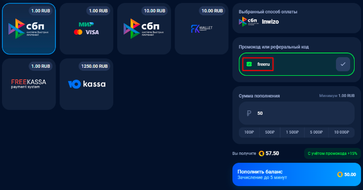 Freeru— +15% к депозиту (при пополнении от 40 ₽);cfg— открытие бесплатного кейса «Антарктида» при депозите и отыгрыше 50%.