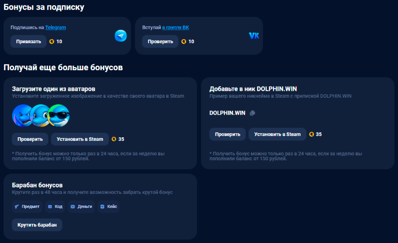 Dolphin — это онлайн-площадка для открытия кейсов по играм CS2, Dota 2 и Rust, где пользователи могут получать скины, участвовать в розыгрышах и использовать промокоды на бонусы. Сайт появился относительно недавно, но уже успел привлечь внимание игроков за счёт простого интерфейса, большого выбора кейсов и дополнительных игровых режимов.