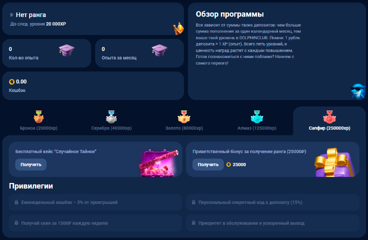 Существуют пять уровней: бронза, серебро, золото, алмаз и сапфир. С ростом статуса увеличиваются бонусы: кешбек, бесплатные кейсы, эксклюзивные промокоды и приоритетная поддержка.