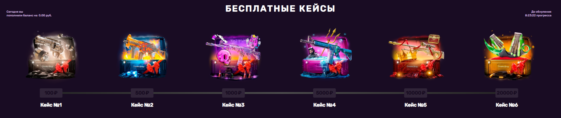 Шесть бесплатных кейсов за депозит. Пополняйте баланс и получайте доступ к шести бесплатным кейсам. Условия для каждого кейса указаны на скриншоте. Прогресс обнуляется ежедневно в 00:00 по МСК, так что не упустите шанс!