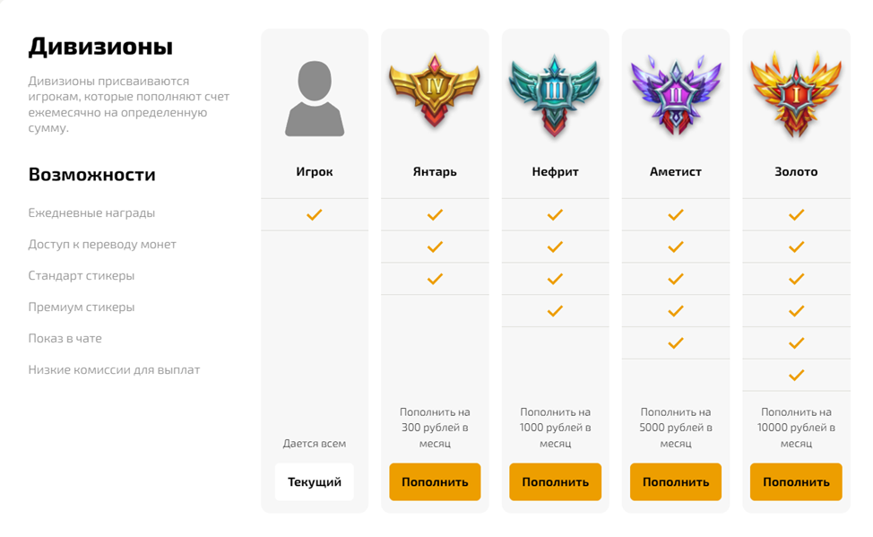 На сайте действует система лояльности для постоянных игроков. Им присваиваются уровни, называемые дивизионами. Их всего 4: Янтарь, Нефрит, Аметист, Золото. Чем выше статус игрока, тем больше дополнительных возможностей ему доступно.