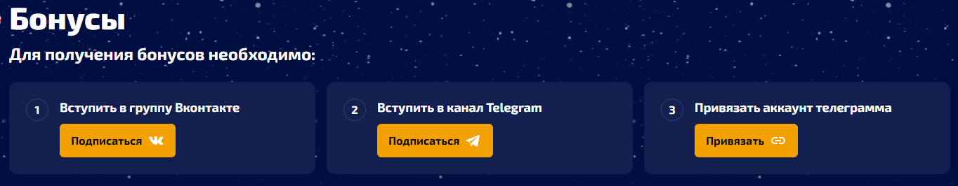 50 бесплатных монет. Для получения игроку нужно подписаться на Telegram-канал сайта, а также настроить двухфакторную аутентификацию в профиле.