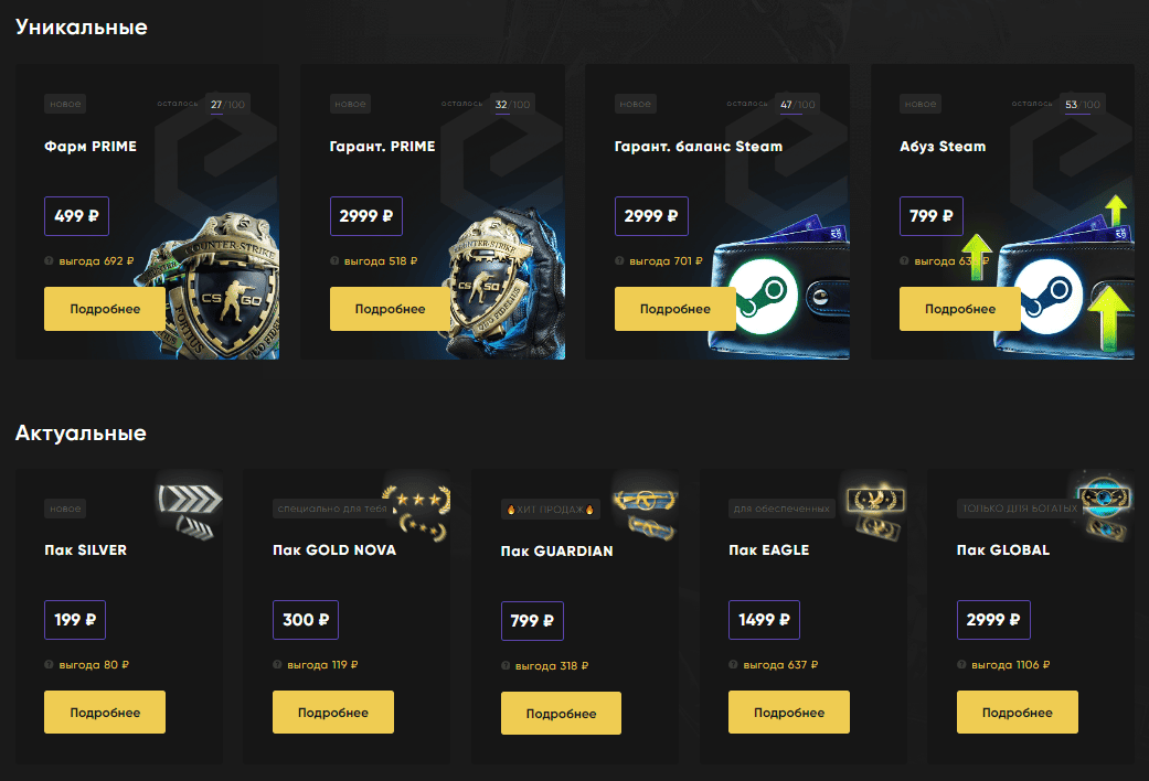 Акции – специальное предложение на вкладке «Акции». Например, наборы, включающие Epic Coins, баланс на сайте, бесплатные кейсы, Prime-статус для аккаунта Steam и другие приятные бонусы.