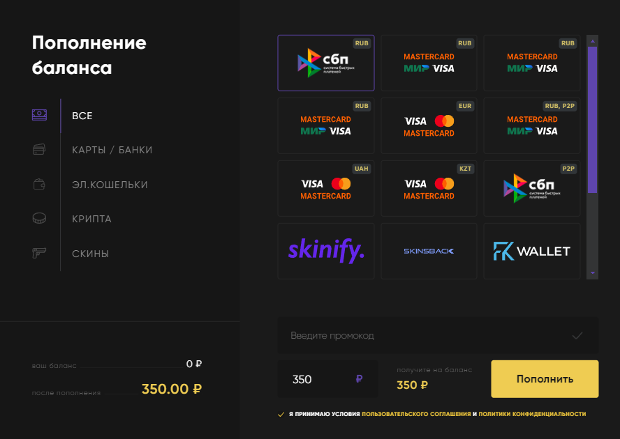 Промокоды – они доступны на официальных страницах проекта (например, в группе VK и Telegram-канале). Промокоды можно ввести в правом верхнем углу сайта или при пополнении баланса.