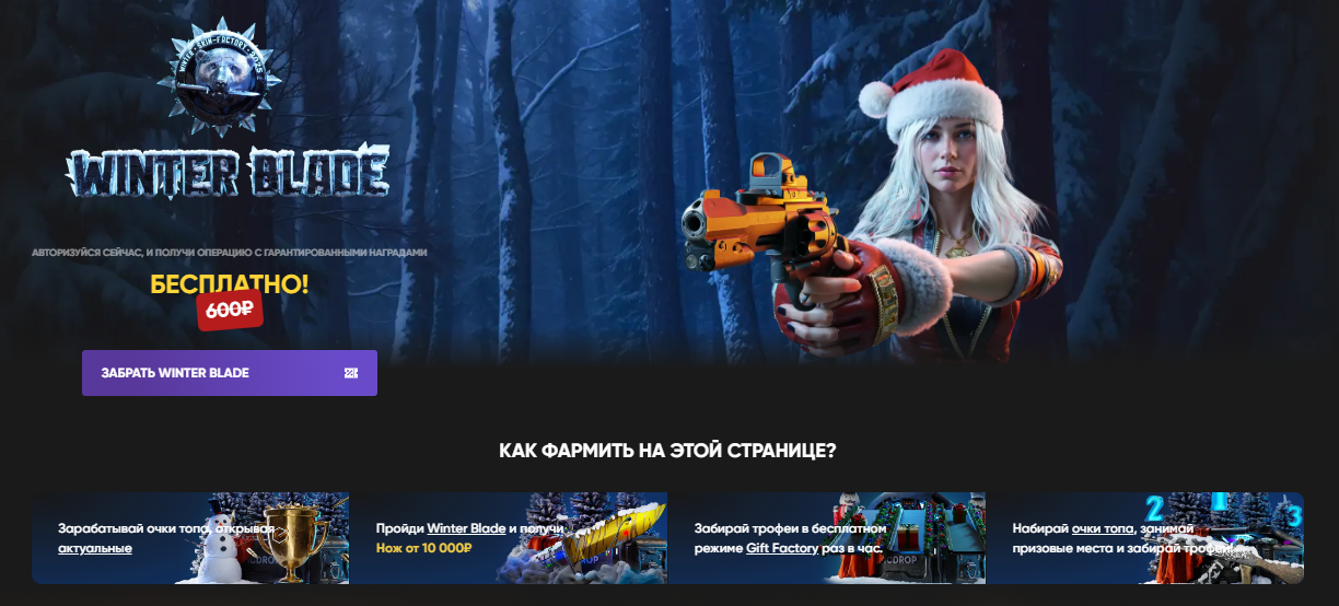 Специальные операции: На платформе проходит зимняя операция "Winter Blade", где вы можете получить скидку 100% по специальной ссылке. За выполнение простых заданий участники получают снежинки, которые можно обменять на бонусы и скины.