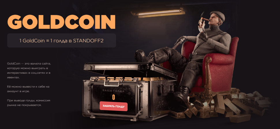Бонусная валюта: Goldcoin можно получать в ивентах и интерактивах на сайте. 1 Goldcoin равен 1 голде в Standoff 2. Goldcoin можно вывести в виде голды себе на аккаунт.