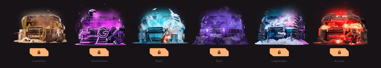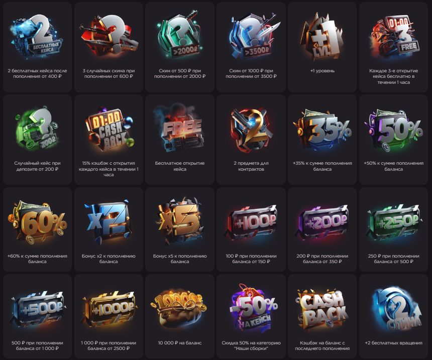 Бонусные бесплатные кейсы: Специальные кейсы, которые даются за депозит на аккаунт в течение 24 часов. Кейсы открываются постепенно. Всего таких кейсов 6 штук – на 100 рублей, на 500 рублей, на 1000 рублей, на 5000 рублей, на 10000 рублей, на 30000 рублей.