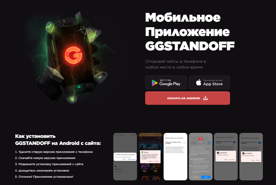 У GGSTANDOFF есть специальное мобильное приложение, которое даёт возможность пользователям с мобильных телефонов получить полный функционал десктопной версии сайта. Для пользователей приложения есть особые бонусы, которые они могут получить только здесь. Мобильное приложение – лучший вариант для игроков с мобильных устройств.
