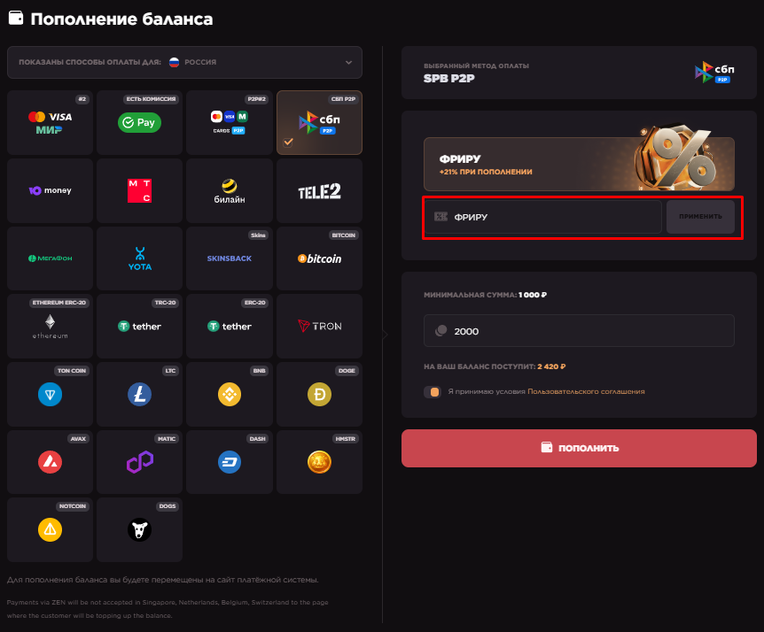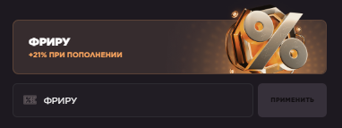 Во вкладке "Пополнить" вводим промокод - "ФРИРУ" (+21% к депозиту);