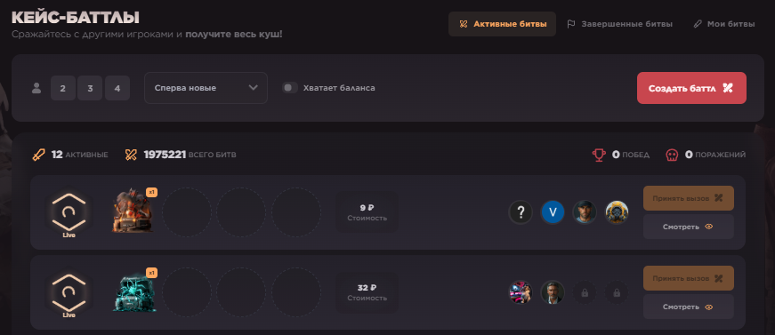 Баттлы: Пользователь выбирает кейс для битвы. К нему могут присоединиться до 3 игроков. Пользователь, которому выпал самый дорогой скин, забирает скины других игроков к себе в инвентарь.