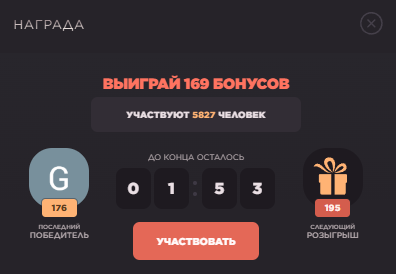 Розыгрыш бонусов: Ежедневно в разделе «Бонусы» проходят розыгрыши от 100 до 500 бонусов. Участвовать можно при депозите от 30 рублей.