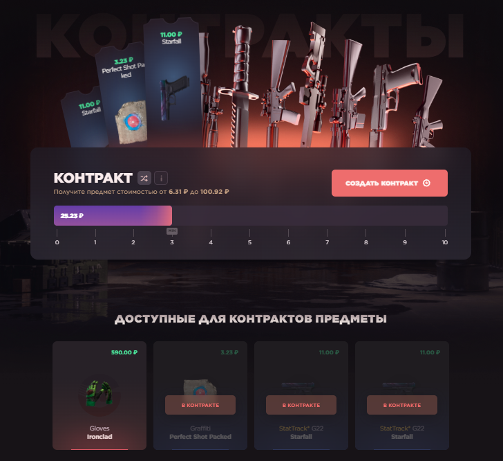 Контракты: Пользователю необходимо добавить от 3 до 10 скинов в список контракта, чтобы получить 1 новый скин лучшего качества.