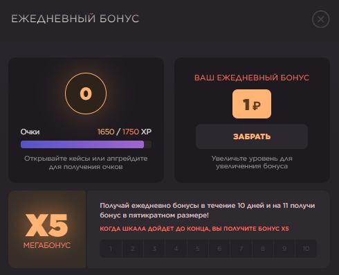 Ежедневный бонус: Бонусный баланс, который можно забирать каждый день в разделе «Бонусы». Размер ежедневного бонуса зависит от уровня аккаунта пользователя. Уровень можно повышать при открытии кейсов и апгрейде скинов. На 11 день ежедневного входа и взятия бонуса пользователю даётся мегабонус в виде пятикратной суммы от той, которую игрок должен был получить на 11 день.