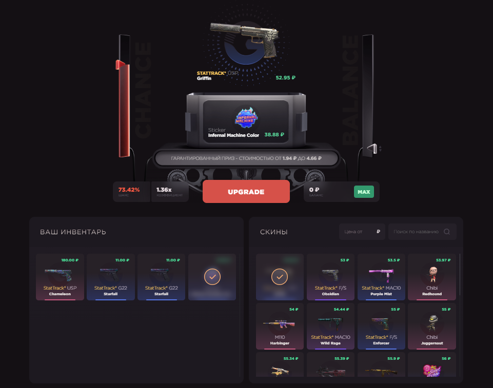 Апгрейды: Вы берёте доступный скин из своего инвентаря и выбираете скин, до которого желаете его улучшить. В зависимости от разности цен зависит и процент успеха апгрейда.