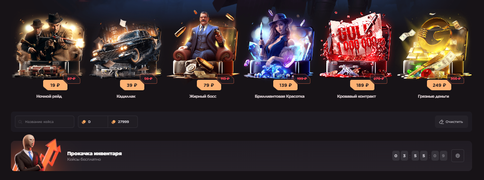 Кейсы, как основное направление сайта, сделаны достойно. На сайте представлено огромное количество авторских кейсов на самые различные тематики. Всё это обилие кейсов дополняет удобный функционал, который расположен на странице с кейсами: сортировка по цене, поиск по названию, сортировка по доступному балансу для открытия, добавление кейсов в избранные, сворачивание отдельных категорий кейсов.