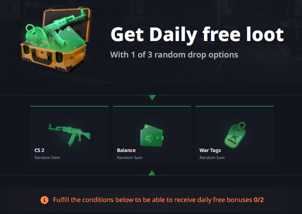 Ежедневный бонус. Игроку даётся бонусный кейс, из которого может выпасть скин, баланс или жетон. Получить бонус можно только, если пользователь пополнил баланс на 5$ за последние 30 дней, и если поменял аватарку своего Steam аккаунта на логотип сайта.