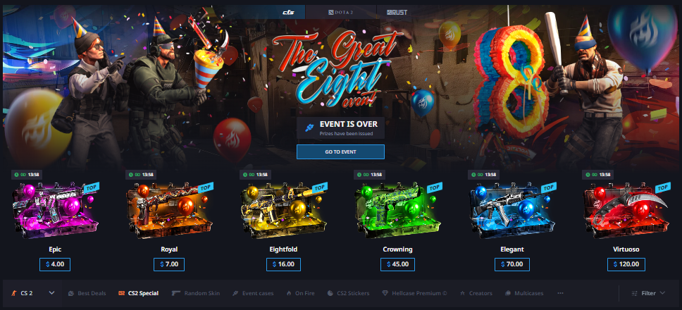 Hellcase предлагает множество кейсов из CS2, Dota2 и Rust. Есть премиум кейсы, кейсы от стримеров, кейсы в честь определённого события, кейсы со стикерами, фарм кейсы и т.д. Ценовой диапазон для кейсов самый разный. Все цены рассчитаны в долларах США.