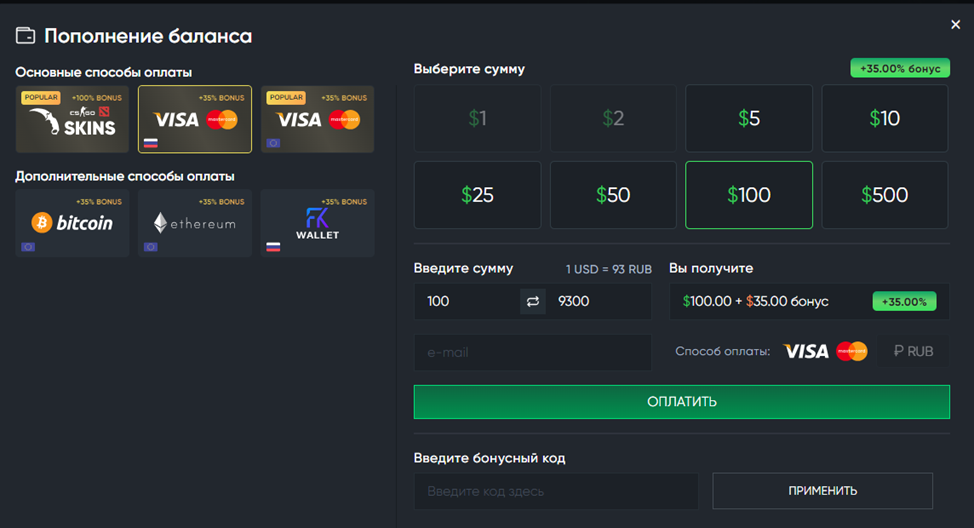 Также на первый депозит сайт даёт бонус +35%. Не пропустите.