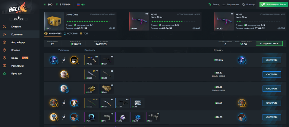 HELLSTORE – сайт для фанатов CS с интересными играми типа crash и coinflip, работающий с 2019 года и имеющий отличную репутацию среди пользователей.