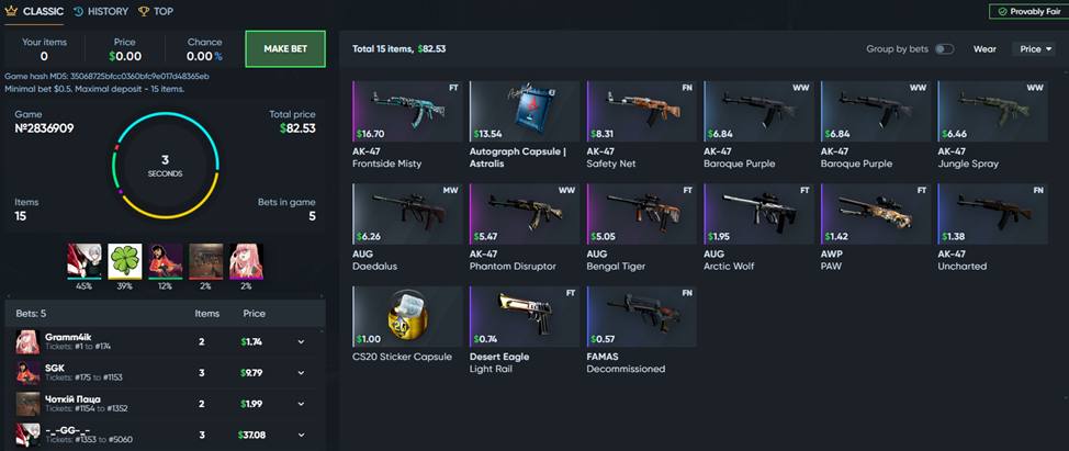 Classic. Классический режим, в котором пользователь играет против всех. Чем больше сумма ставки, тем выше вероятность сорвать куш и пополнить свой инвентарь крутыми скинами из CS.