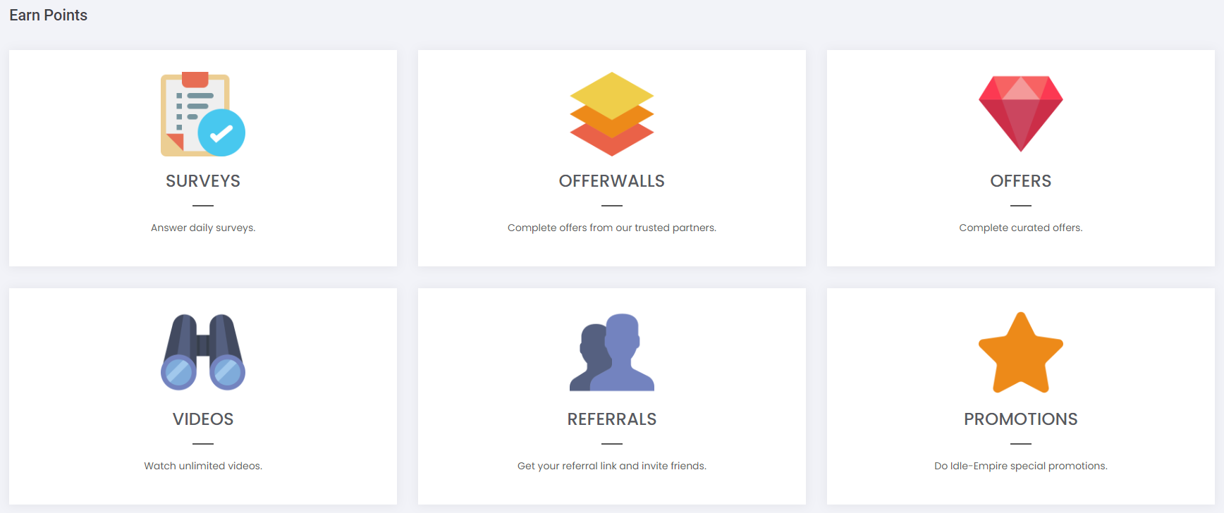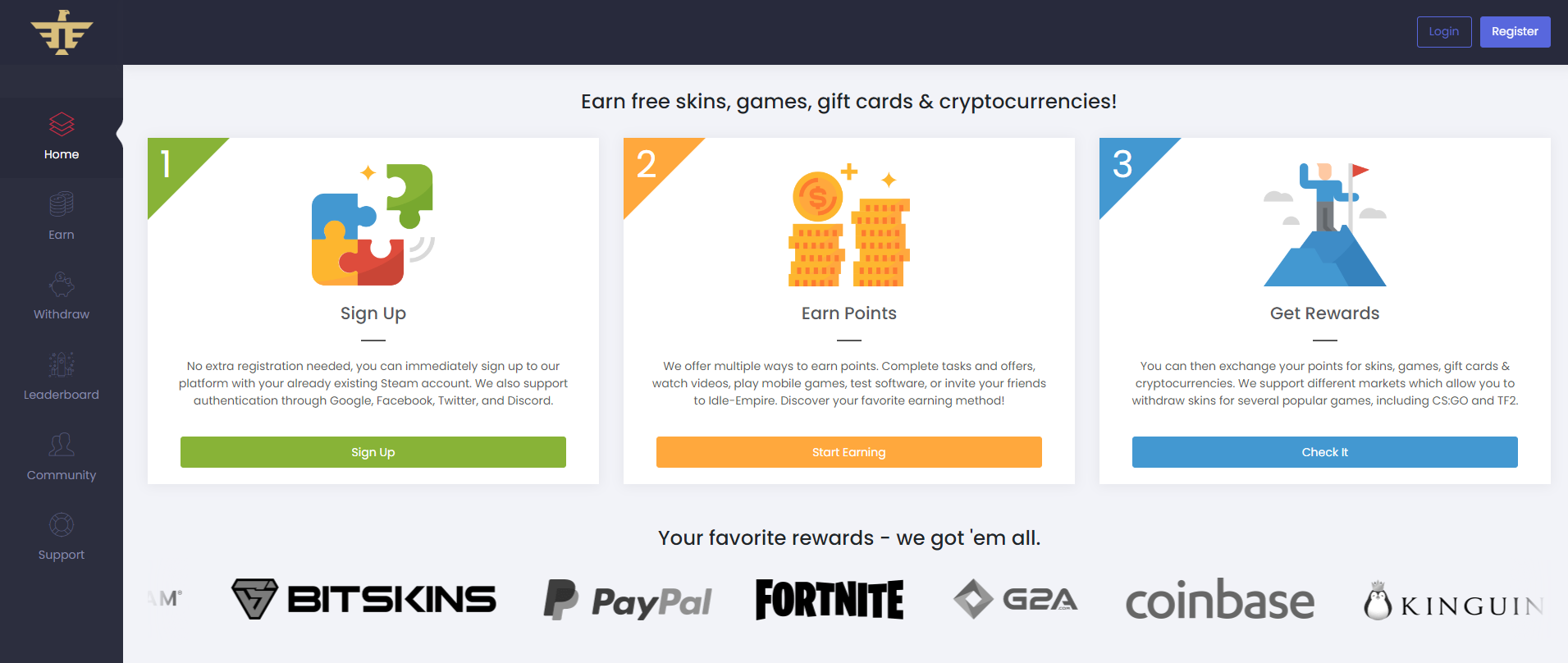 Idle Empire – это сайт, предлагающий пользователям заработать реальные деньги, выполняя различные задания. Пользователи получают за выполнение заданий очки, которые они могут обменять на реальные деньги или скины в различных играх.