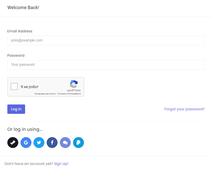Регистрация на сайте доступна через Steam, Google, X (Twitter), Facebook, Discord, PayPal, а также через Email.