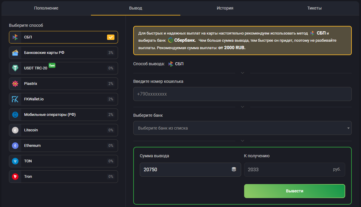 Минимальная сумма для пополнения составляет 100 рублей, а для вывода средств – 500 рублей. Информация о лицензии на сайте отсутствует.