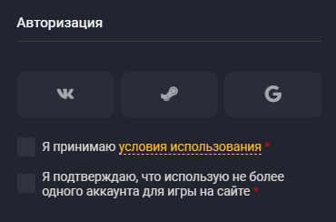 Процедура регистрации проста и быстра. Пользователи могут зарегистрироваться через VK, Google или Steam, приняв условия использования сайта. Верификация аккаунта проводится редко и только в случае подозрений на нарушение правил.