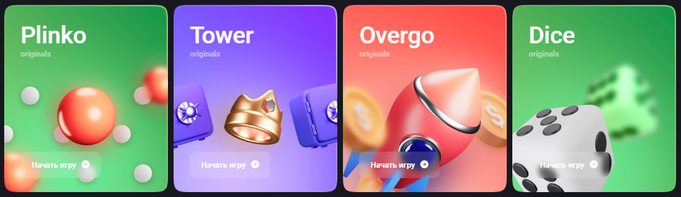 На платформе также представлены разнообразные настольные и карточные игры, включая покер, баккара, блэкджек, рулетку, сик-бо, кости, Plinko, Dice, Tower Crash и Mines.
