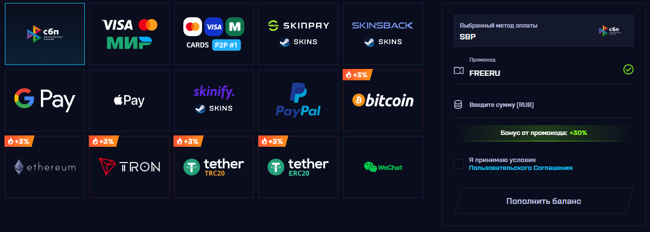 При пополнении указываем промокод - FREERU (+25%) к депозиту.