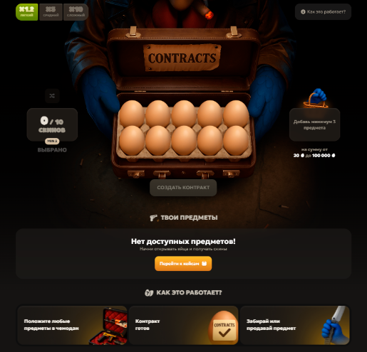 Режим контрактов позволяет объединить несколько скинов в один, более ценный. В контракт можно добавить от 3 до 10 скинов. Система работает случайным образом: итоговый предмет может быть как лучше, так и немного хуже исходных, что делает процесс непредсказуемым и увлекательным.