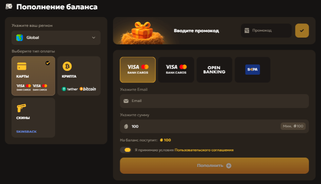 Вывод возможен только в виде скинов на Steam, что гарантирует честность и прозрачность всех операций.