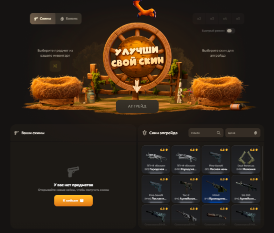 Режим апгрейдов позволяет повысить ценность имеющегося скина. Пользователь выбирает предмет из своего инвентаря и пробует обменять его на более дорогой, указав желаемый коэффициент. Чем больше разница между имеющимся и желаемым скином, тем меньше шанс на успех. Процесс сопровождается плавной анимацией, которая добавляет удовольствия от игры.