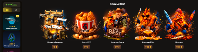Petuh делает ставку на оригинальные сборки, поэтому игроки найдут здесь не стандартные копии популярных кейсов, а авторские подборки с редкими и ценными скинами.